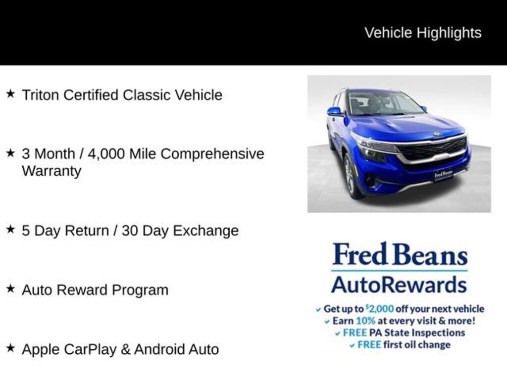 As a Triton Certified Classic Vehicle, this 2021 Kia Seltos S has undergone a rigorous inspection and comes with a 3 Month / 4,000 Mile Comprehensive Warranty, ensuring your peace of mind. With the added benefits of a 5 Day Return / 30 Day Exchange policy and the Auto Reward Program, you can feel confident in your purchase.